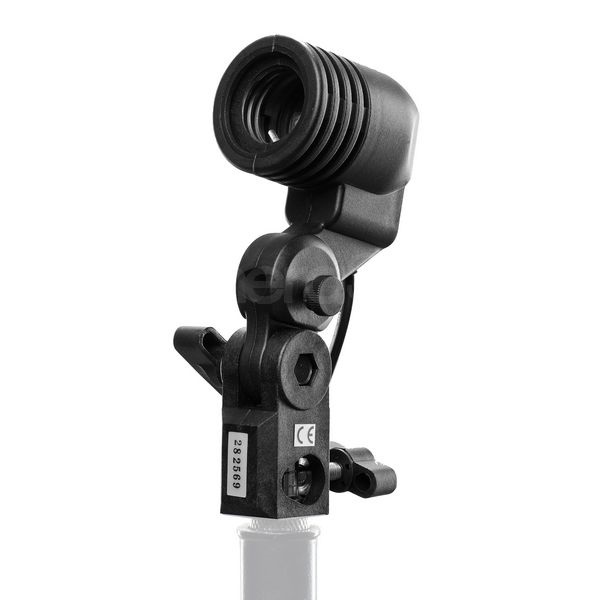 The LH-27SU is a lighting bracket that can mount any E27-based light bulb. This bracket is equipped with a tilting lever and umbrella hole, which enables you to mount any studio umbrella. The LH-27SU features a standard spigot adapter and can be used on any light stand with a stud/spigot mount.