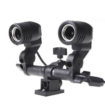 The Double Lamp Holders fits a standard light stand. Easily adjustable twin swivel head means it can be positioned with full control. 220v (UK 3 pin plug fitted not pictured apologies) flash or bulb can be used with this universal screw-in socket. on / off switch on the back of each light. Umbrella holder slot.