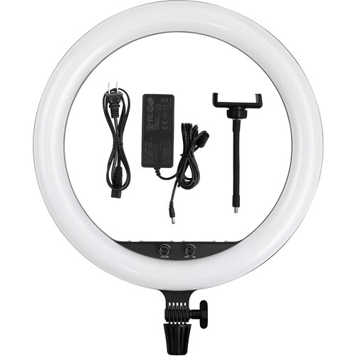 This LR150 Bi-Color LED Ring Light in black from Godox has a distinctive shape and variable color temperature from 3000-6000K to match other fixtures, ambient light conditions, or just for creative expression. The light can be mounted to an optional grip head or stand, allowing you to shoot through it for a silky smooth, near-shadowless effect that is flattering to your talent's complexion. A smartphone holder is included which makes it great for selfies. The light creates unique circular catchlights in your subject's eyes and you can make color and light intensity adjustments from a simple knob on the fixture. It runs on USB power so you can take it anywhere and operate it from your computer, laptop, or a power adapter.