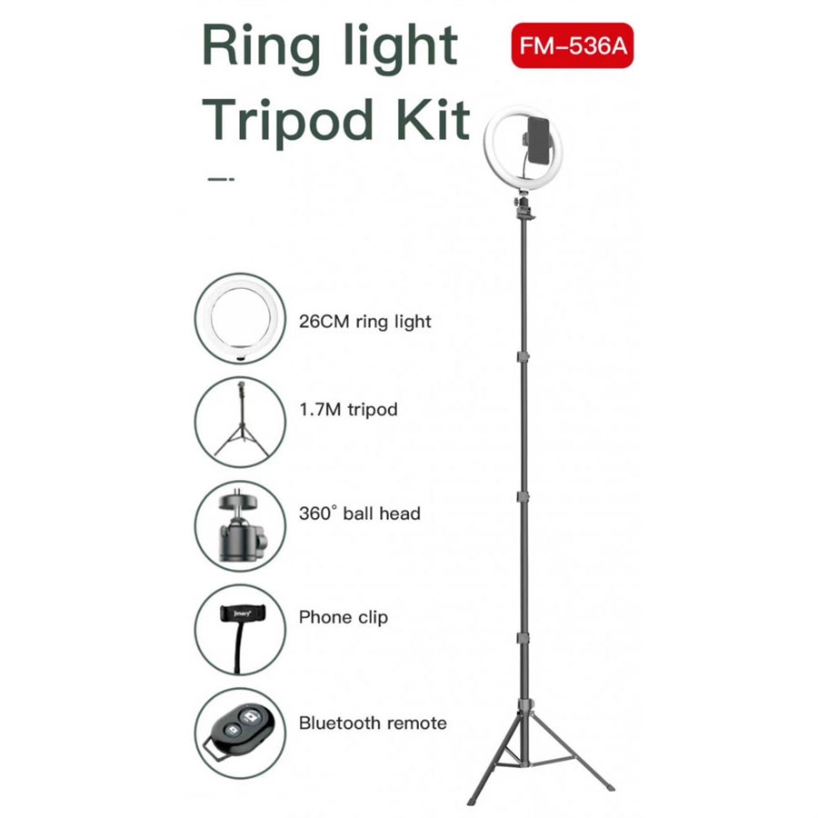 SPECIFICATION LED RING LAMPProduct : 10 inch ring rightVoltage : 5VPower : 8-10WPower Supply : USB supplyCharge Power : DC5VWeight : 0.6kgTrend : 1/4 universal threadWire length : 2MOutside Circle Size : 26 cminside circle size : 20cmbeads QTY : 120 Colour tones : warm light/mix light/ cold lightcolor temperature : 3000-6500kcolor rendering index : 96SPECIFICATION TRIPODMaterial : PLastic and AluminumMax.tube Diameter : 26mmLoading Capacity : 1kgWeight : 460gSection : 4Folded Height : 52cmMax Height : 170cmMin Height : 55cmTop screw : 1/4inchColour : Black