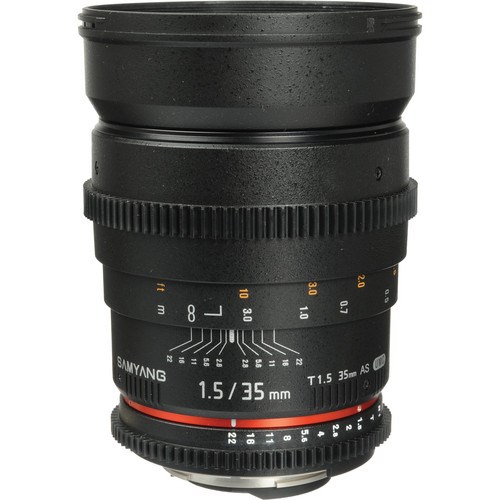 The Samyang 35mm T1.5 Cine Lens for Nikon F with geared, manual focus and aperture control rings, is optimized for digital cinematography. The aperture ring has been "de-clicked" for smooth iris pulls, and depth of field markings provide an essential aid to focus pullers. Optically, this lens is identical to the Samyang 35mm f/1.4, which is known for its excellent sharpness, contrast and bokeh.